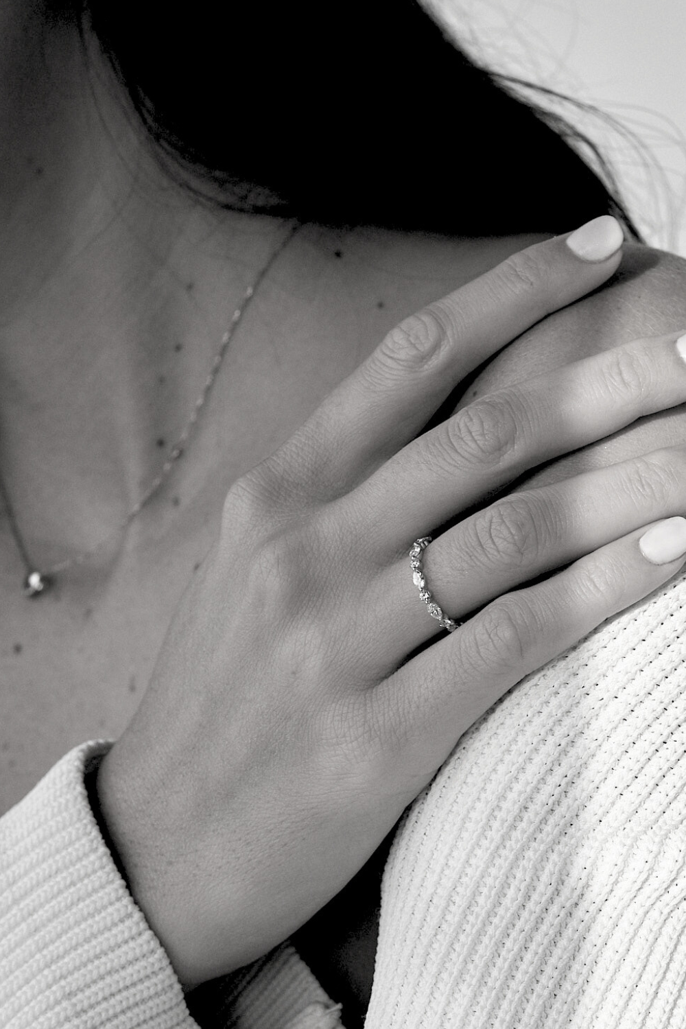 Designed for romantic minimalists, crafted in platinum with sparkling Marquise diamonds in between round cuts.