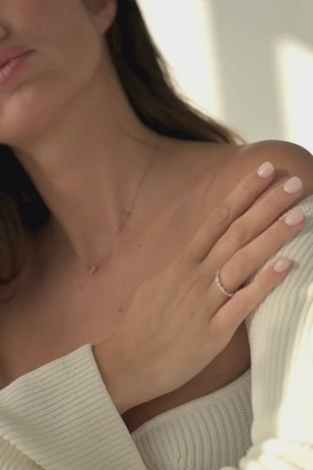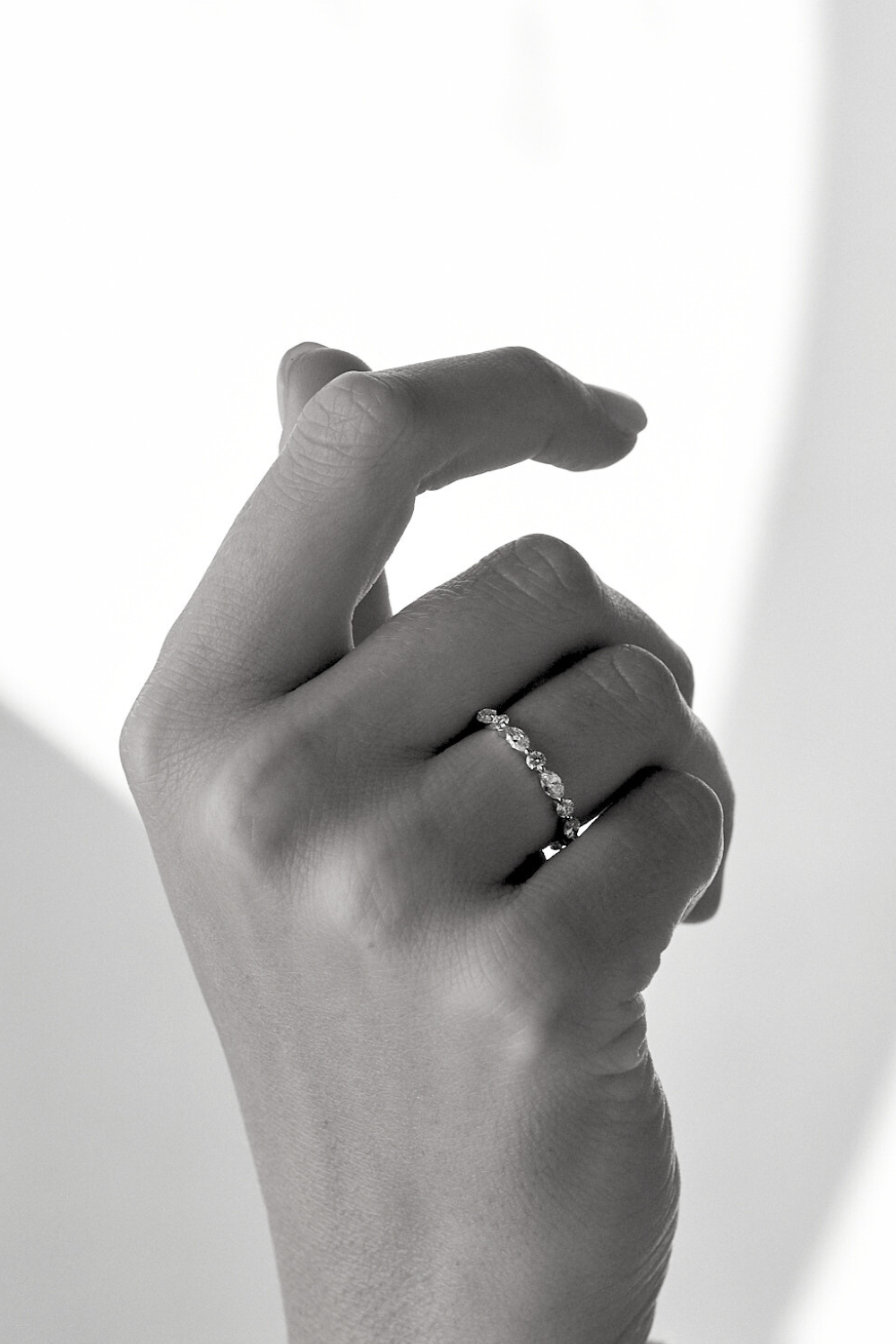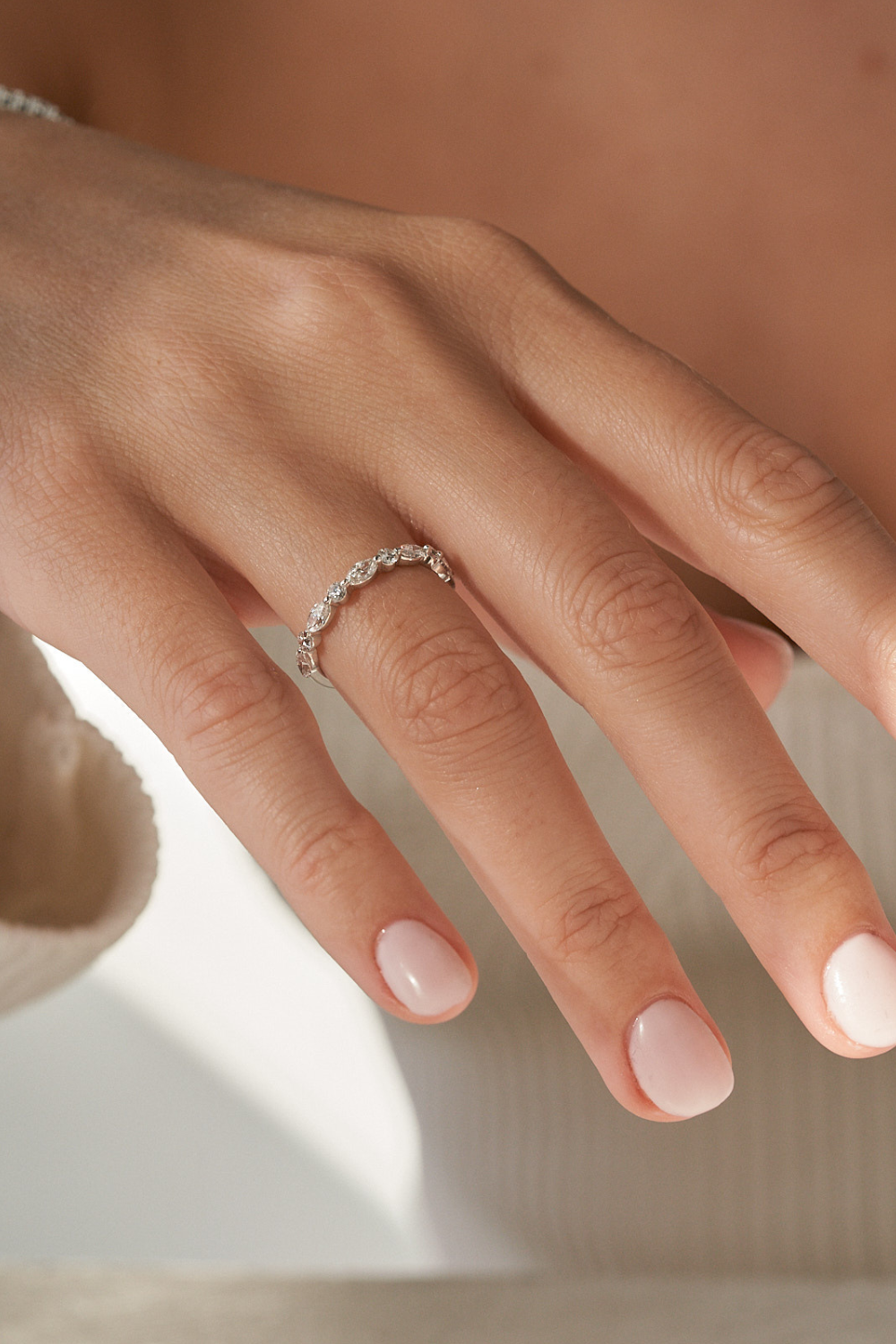 Designed for romantic minimalists, crafted in platinum with sparkling Marquise diamonds in between round cuts.